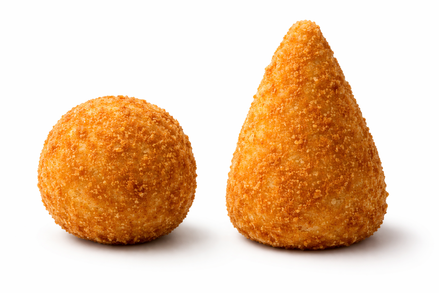 In Catania and eastern Sicily, you’ll more often hear arancini, and they’re frequently shaped into a point, said by some to resemble Mount Etna.