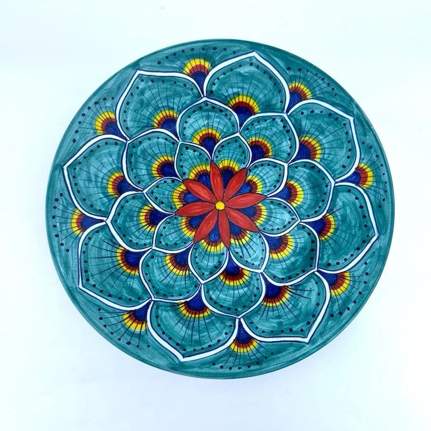 Every time I see a plate painted in the pavone style, with its repeating feather-like forms radiating out in brilliant color, I feel a connection to something timeless. The “peacock” design is more than decoration — it’s a language that artisans have used for centuries to bring rhythm, beauty, and abundance to the Italian table.